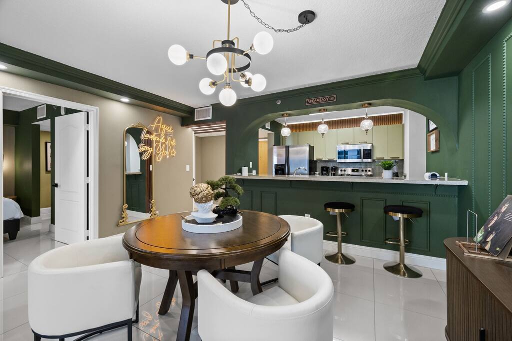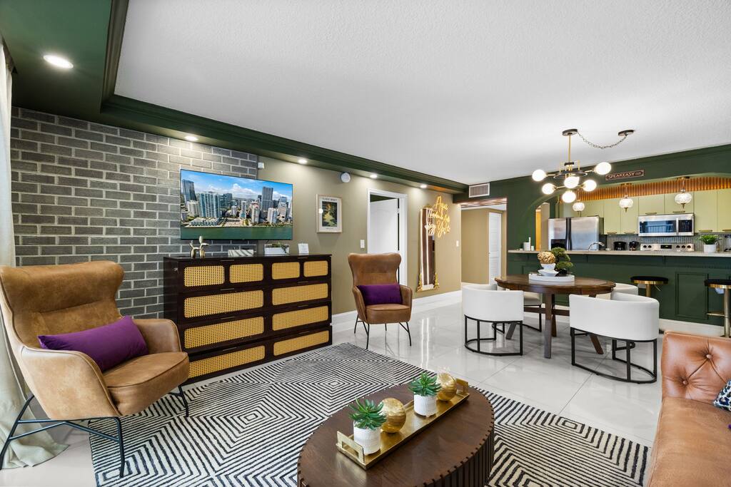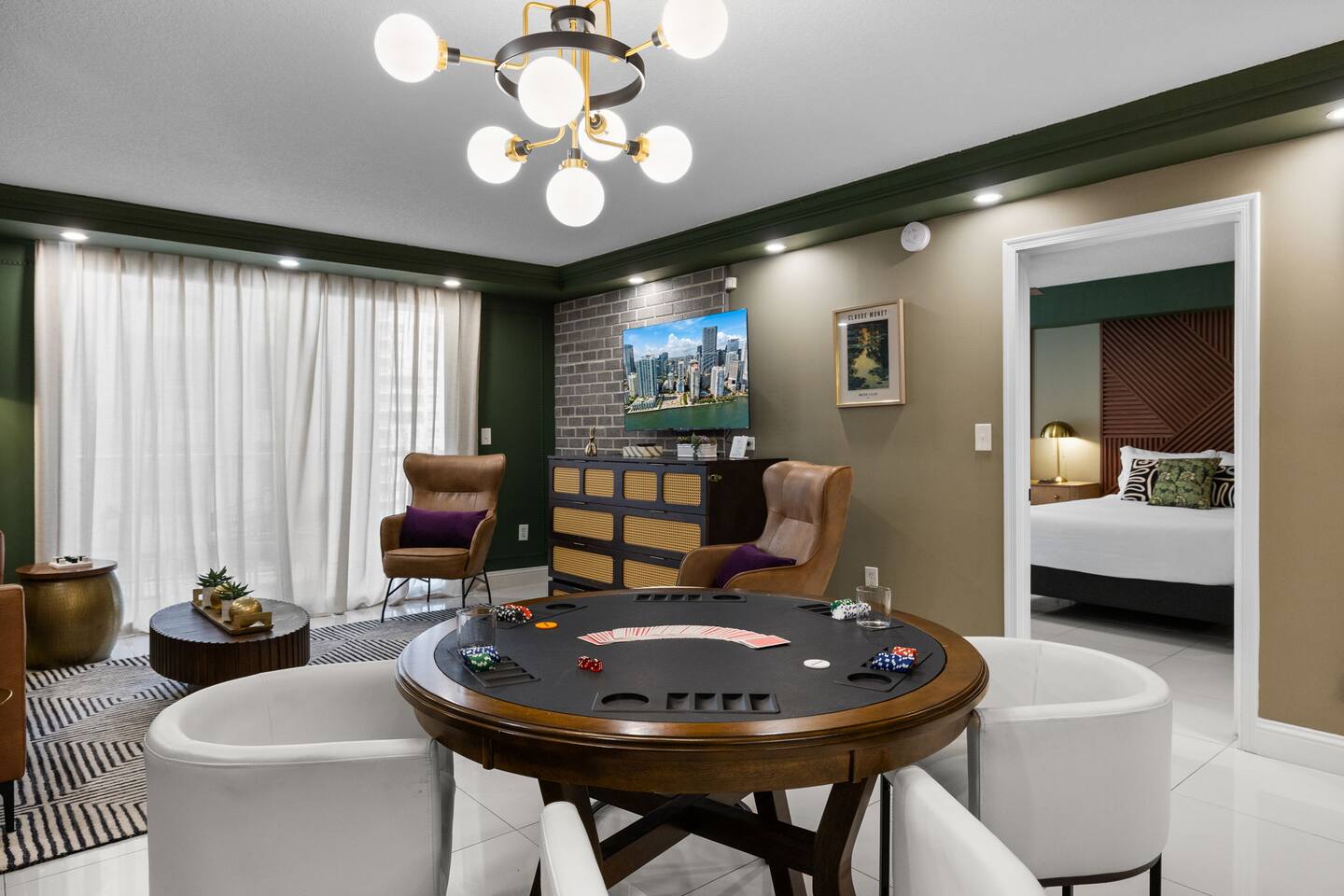 Step into your stylish Brickell escape—moody, modern & made for fun. Enjoy bay views, resort pools, Jacuzzi & gym, plus a dining table that flips into a poker table for game night. Walk to Miami’s best bars, dining & shops. Your private speakeasy in the sky—perfect for play, chill & city vibes. ✨ Book your Brickell getaway today!